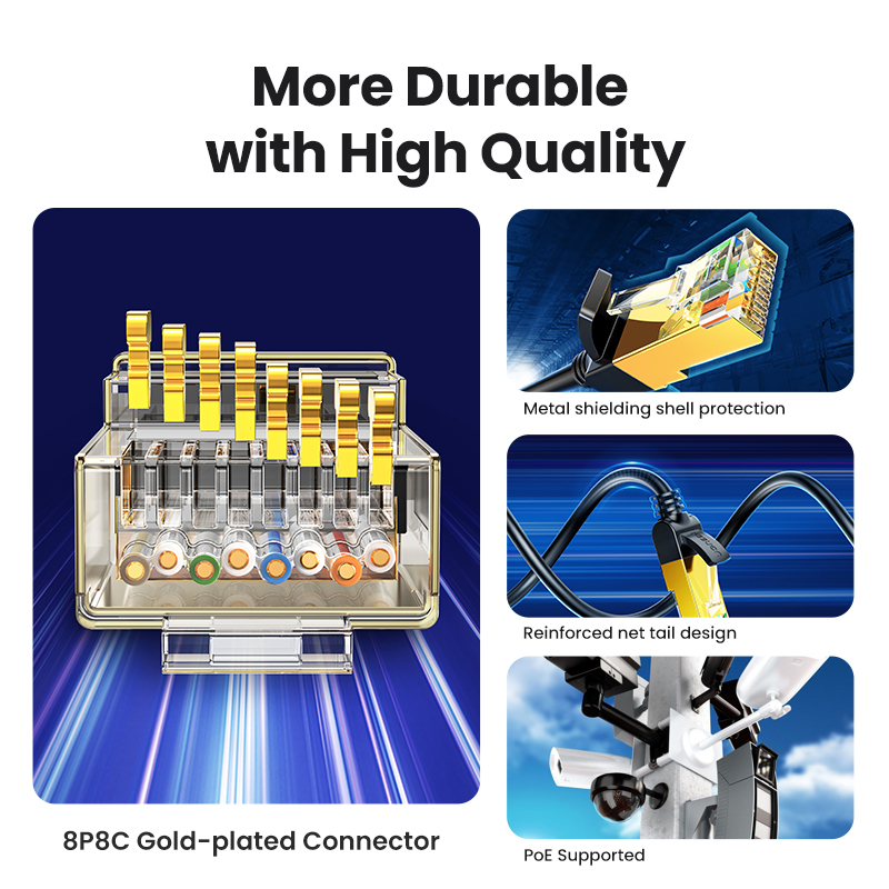 Chuẩn Cat7 tốc độ cao: Hỗ trợ băng thông lên tới 600MHz và truyền dữ liệu với tốc độ tối đa 10Gbps, giúp đảm bảo kết nối Internet nhanh chóng, không gián đoạn.