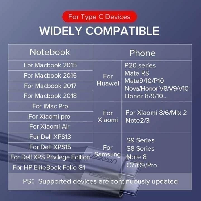 Tương thích: Laptop, smartphone, máy tính bảng, dock USB-C, màn hình USB-C,...