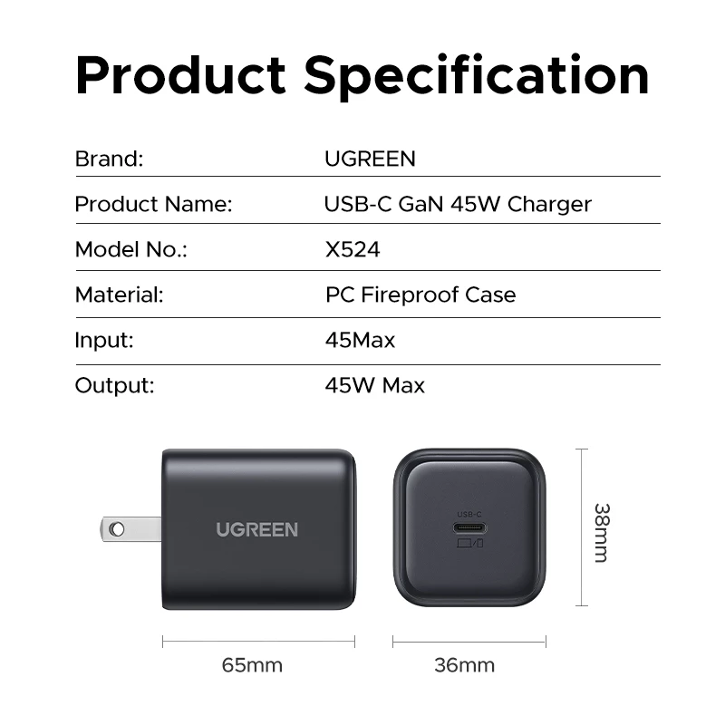Thông số kỹ thuật: Củ sạc nhanh GaN 45W Type-C Hỗ trợ QC4+, PD3.0 Ugreen 65050B cao cấp